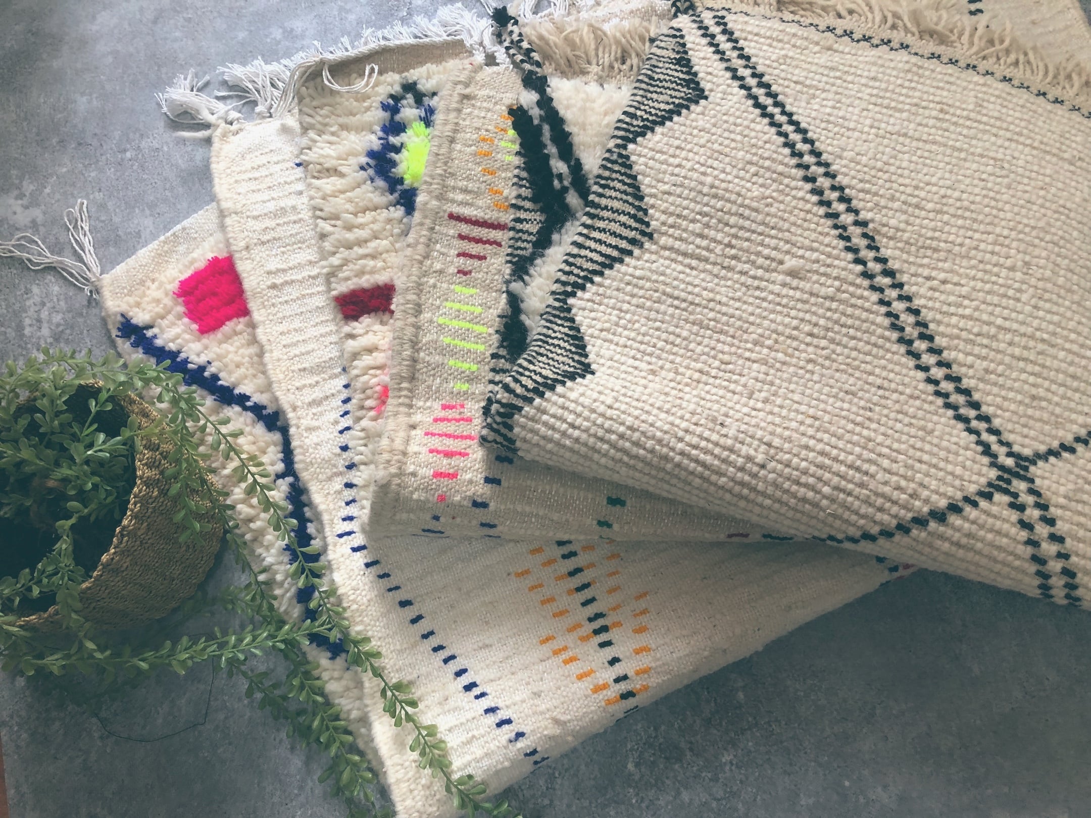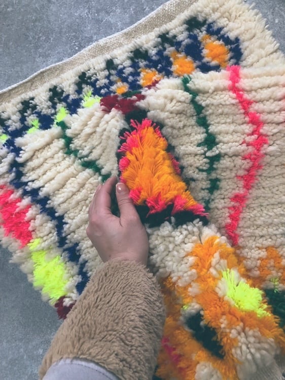 柔らかなウール地にネオンピンクやグリーンで織られた色合いがとっても可愛い!! お部屋の雰囲気も気分も明るくなる逸品です、(*´꒳`*) ***************** 原産国:モロッコ サイズ : 約70㎝×約106㎝(フリンジ約3/5㎝) 素材 : ウール ***************** モロッコから直輸入したアジラルラグ。 モロッコ中部のアジラル地方で、長い歴史をもつ種族ベルベル人女性によって、ひとつひとつ丁寧に、手織りで織られる「アジラルラグ」。 世代から世代へ受け継がれていく伝統的な織り物。 良質な天然ウールを用いて、カラフルでデザイン性溢れる、世界で一つしかない柄となっています。 織り手さんのその時のインスピレーションで紡ぎ出されるふたつとしてない、芸術作品です。 玄関やリビングの絨毯として。 壁にかけてインテリアとして。 日常に彩りをお届けいたします。 ***************** 〈注意事項〉 ・手織りのため、歪みや色ムラ、多少のほつれ.植物の繊維がある場合がございます。 愛のある手仕事の特徴として、ご理解いただける方のみのご購入をお願いしております。 ・ご使用のモニターや日光により、お色味の違いがみられる場合がございます。 ・羊毛を使用しているため、独特な匂いがする場合がございますが、ご使用と共に軽減されるものです。