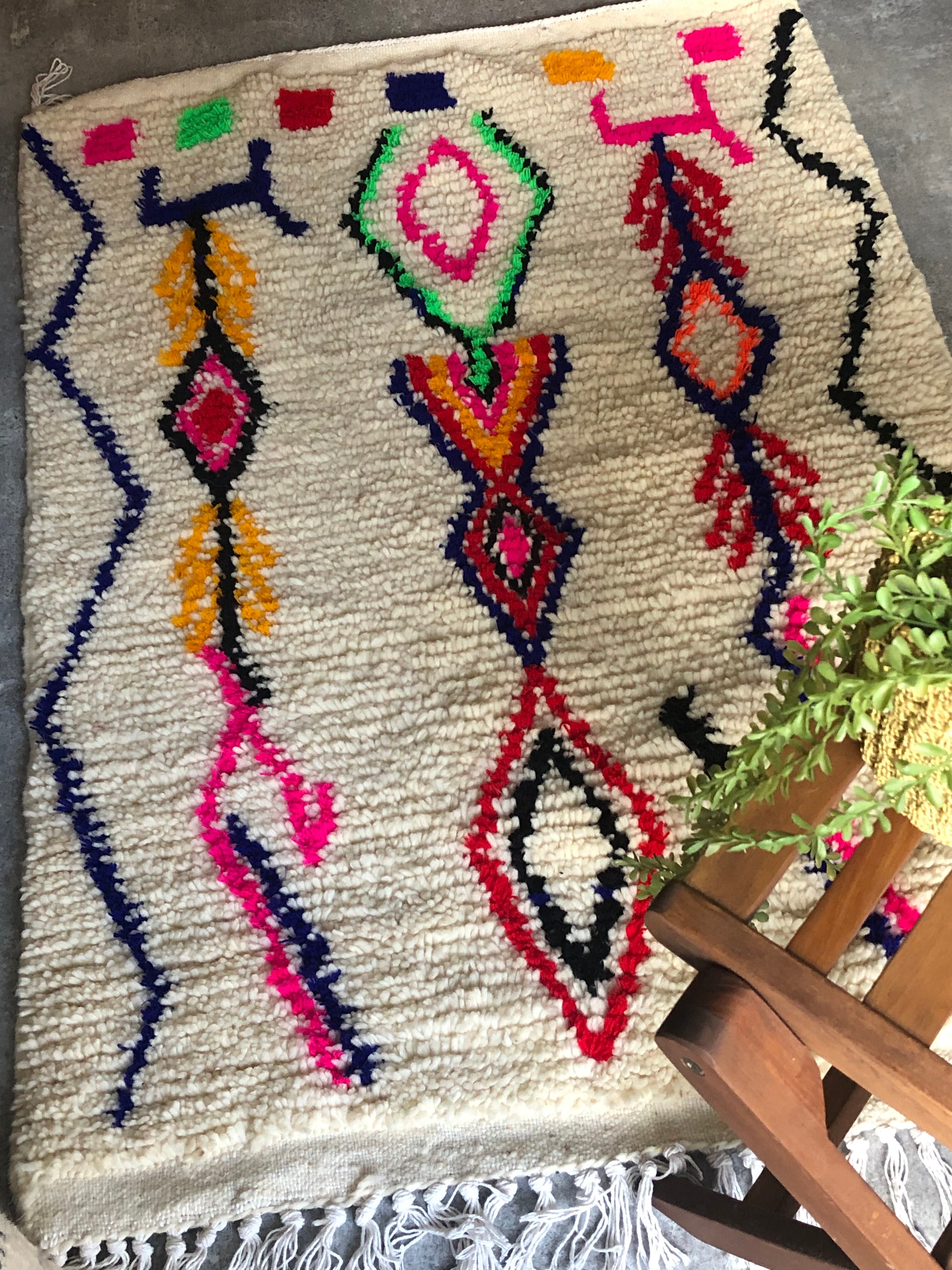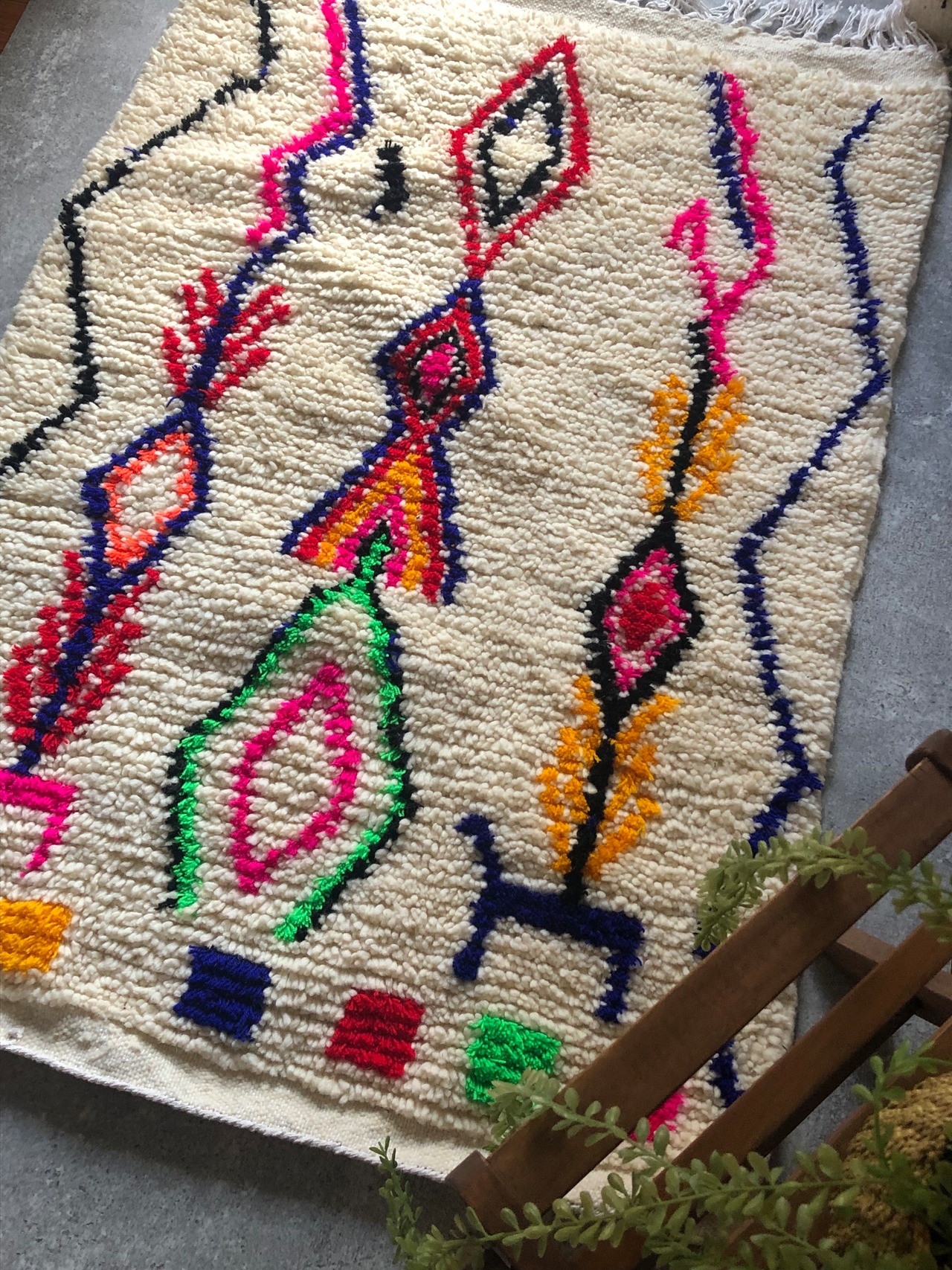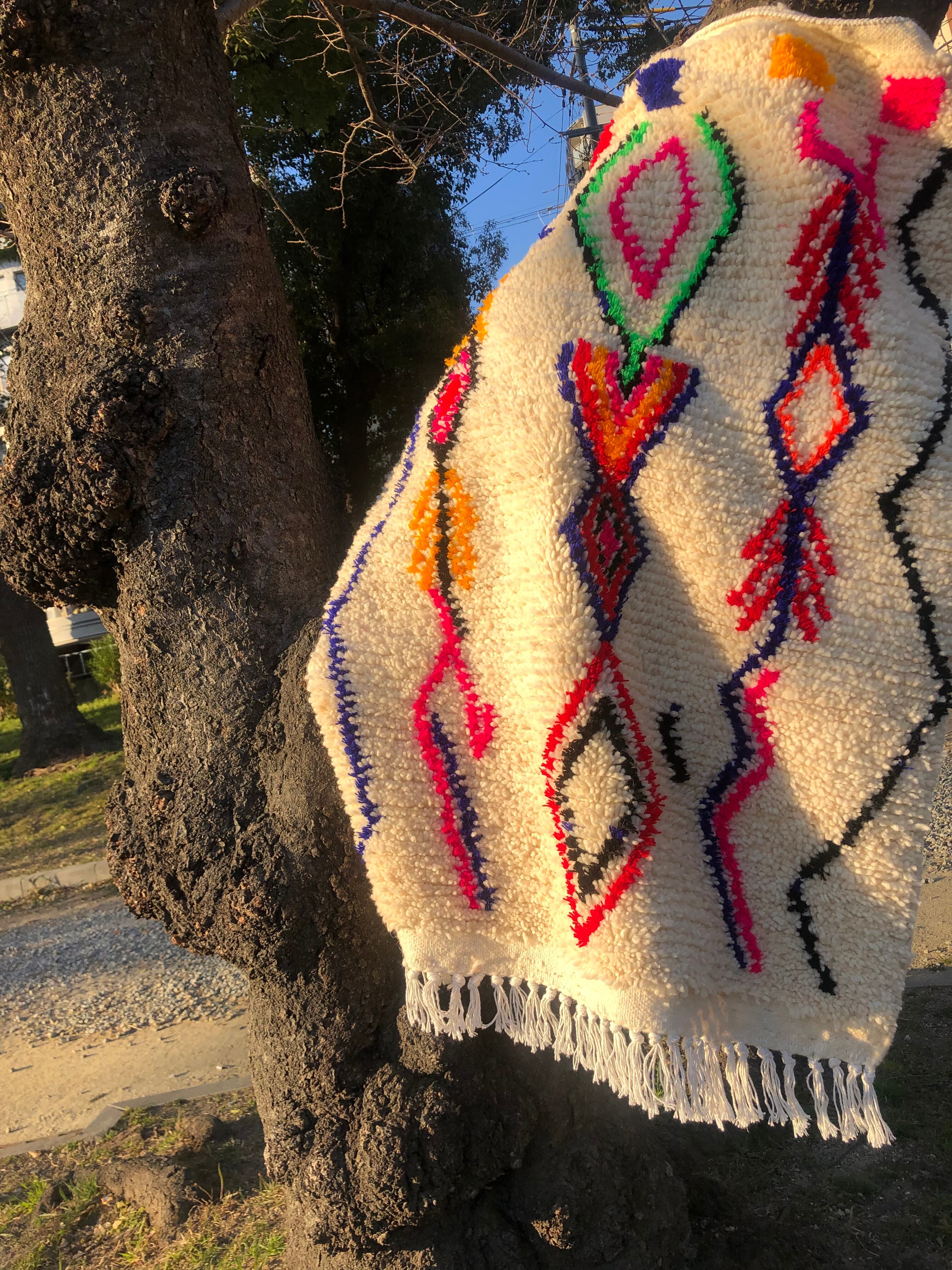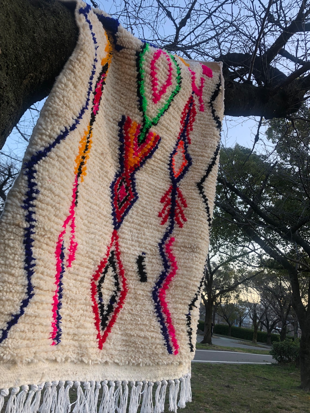 モロッコ中部のアジラル地方で、長い歴史をもつ種族ベルベル人女性によって、ひとつひとつ丁寧に、手織りで織られる「アジラルラグ」。