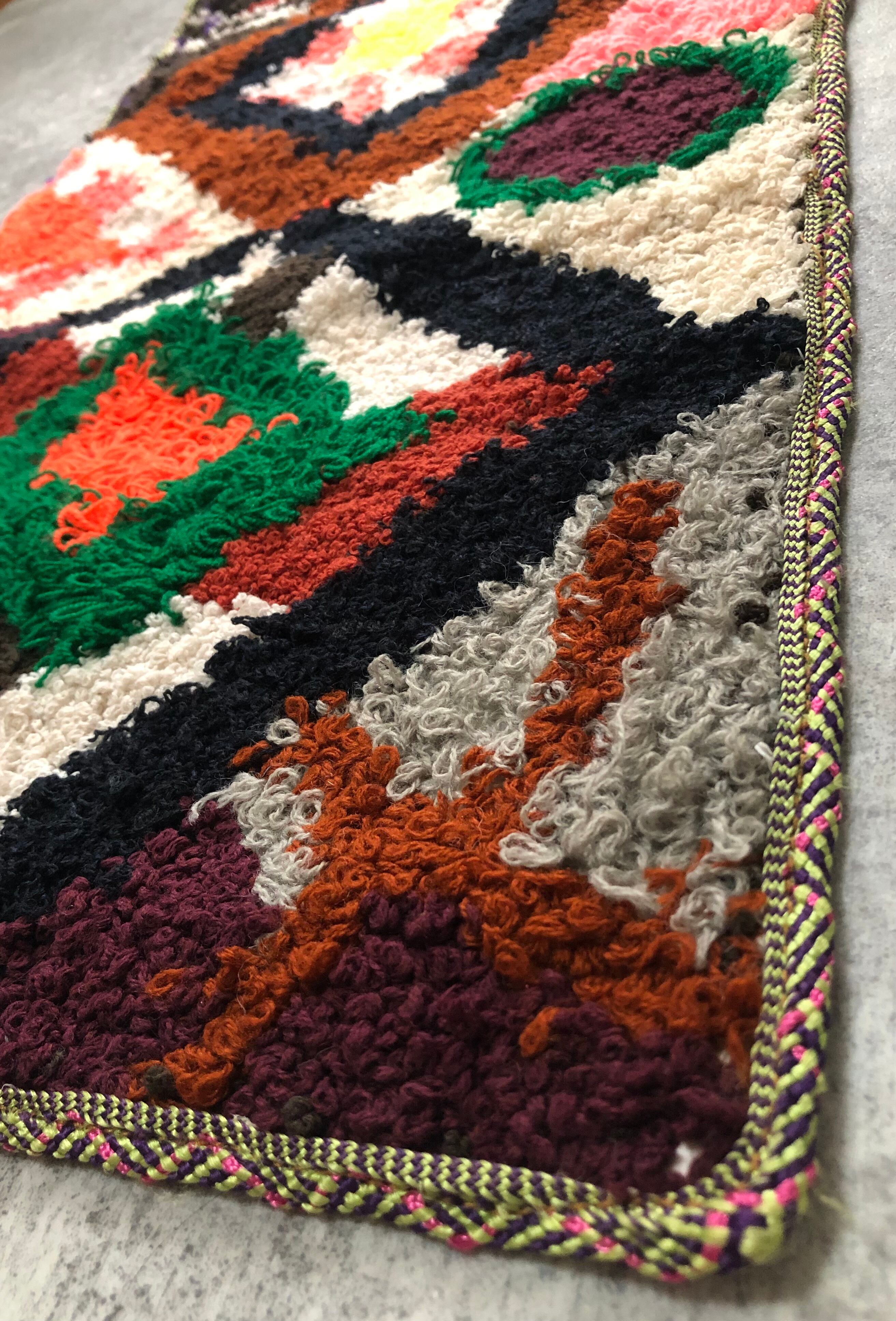 アジラル地方にて、シリアルや小麦粉、穀類が入っていた袋を再利用して、着なくなったセーター等の毛糸を使い刺繍をしたアップサイクルな小さなラグです。