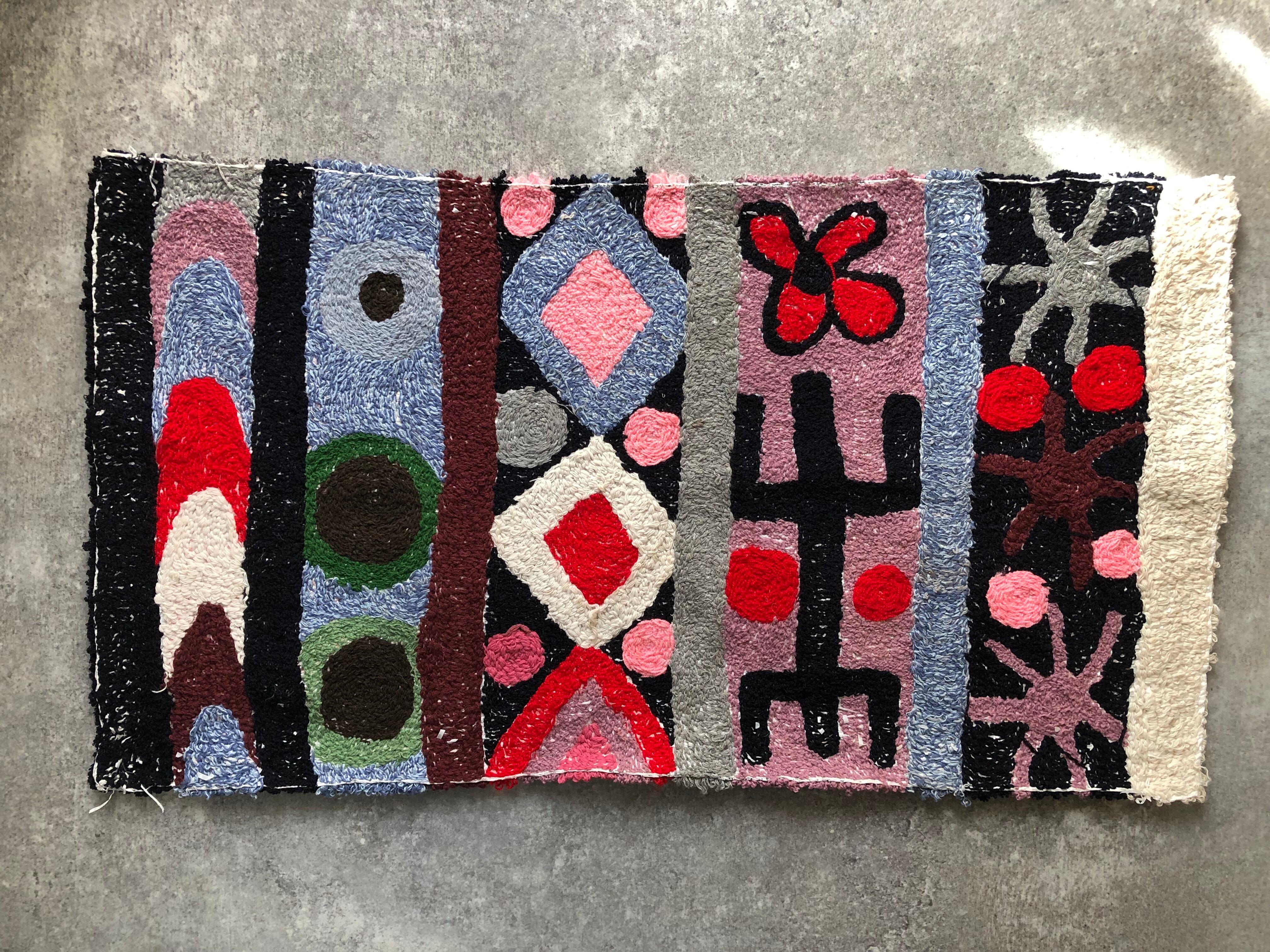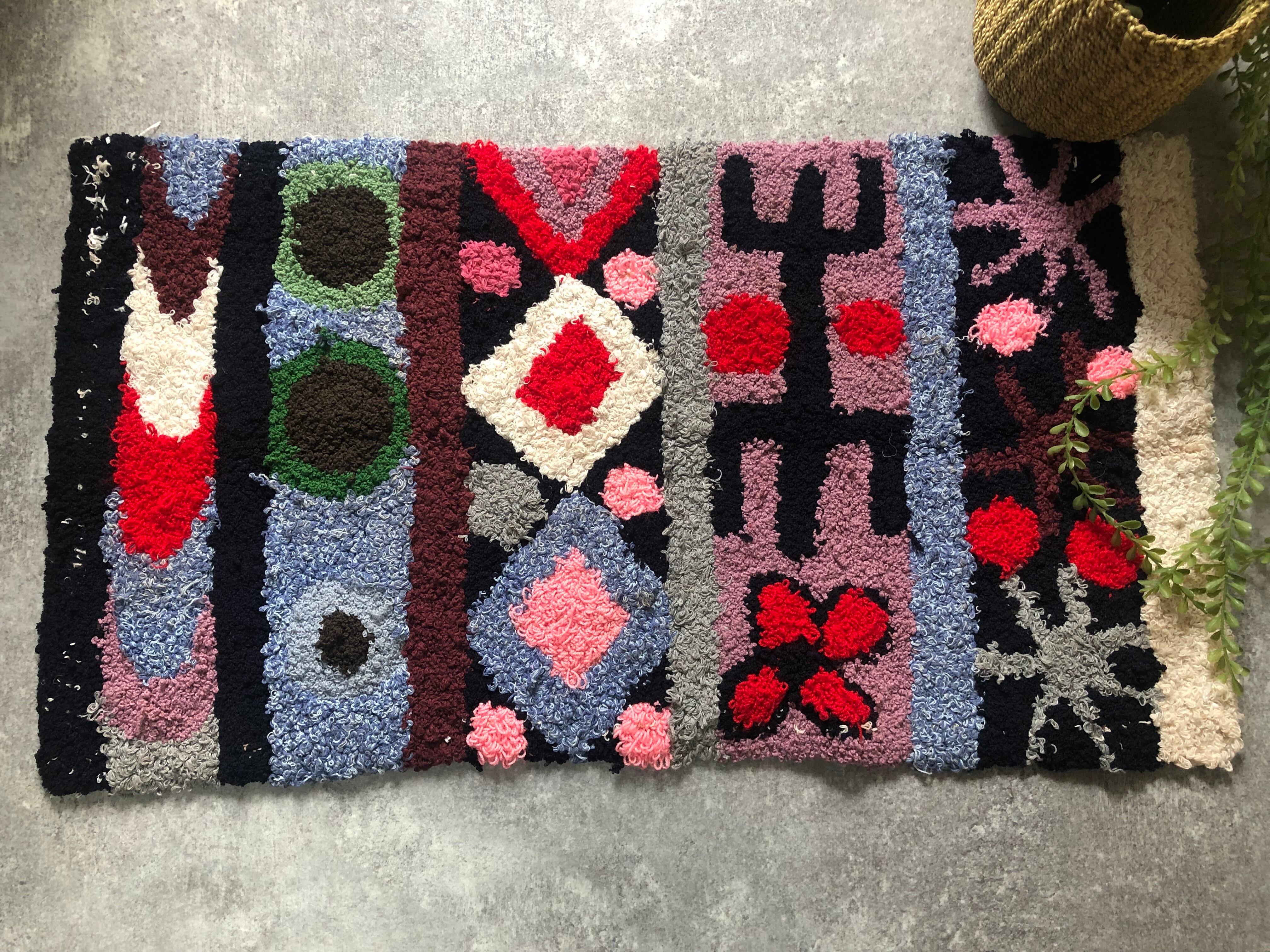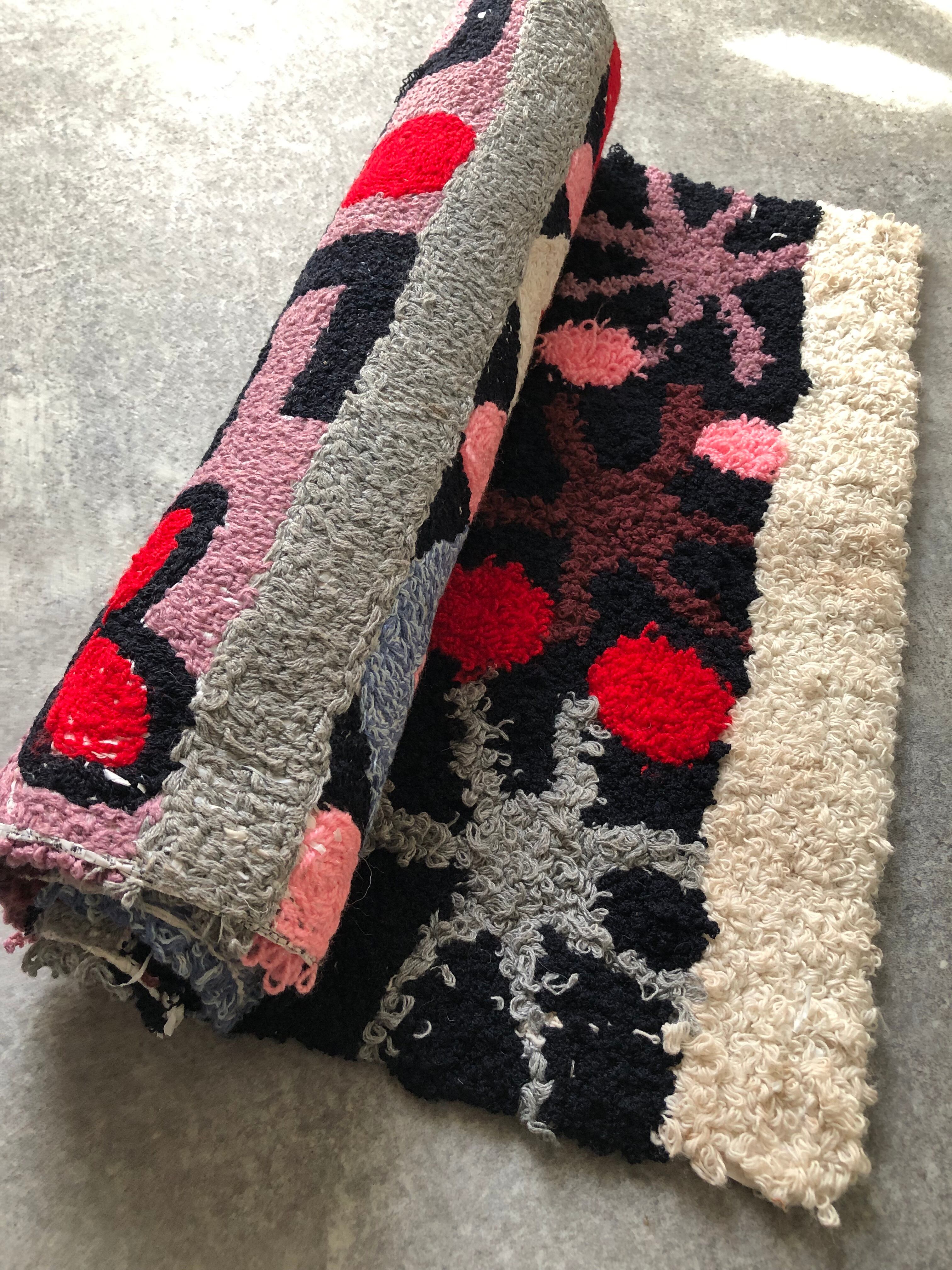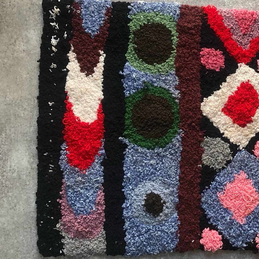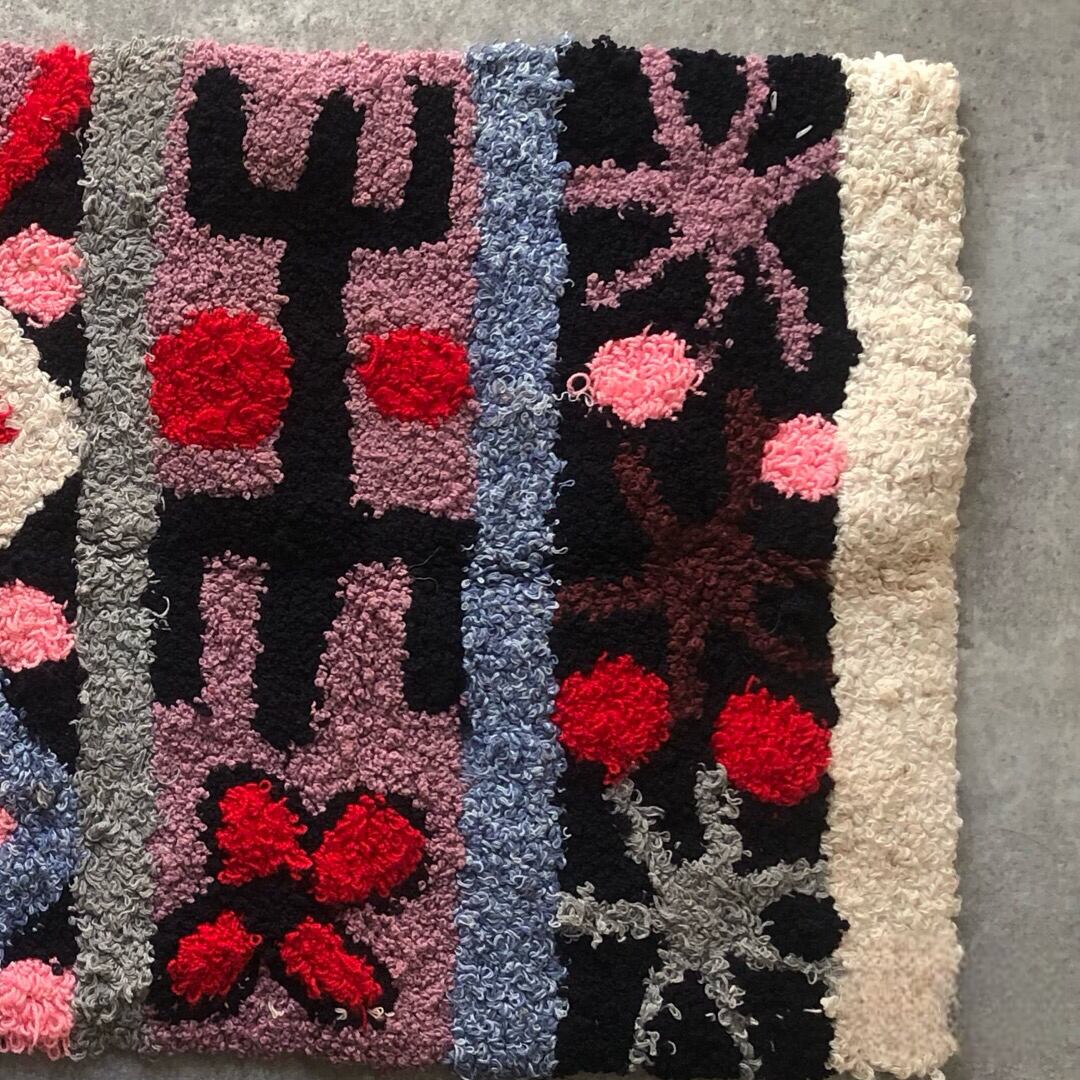 アジラル地方にて、シリアルや小麦粉、穀類が入っていた袋を再利用して、着なくなったセーター等の毛糸を使い刺繍をしたアップサイクルな小さなラグです。