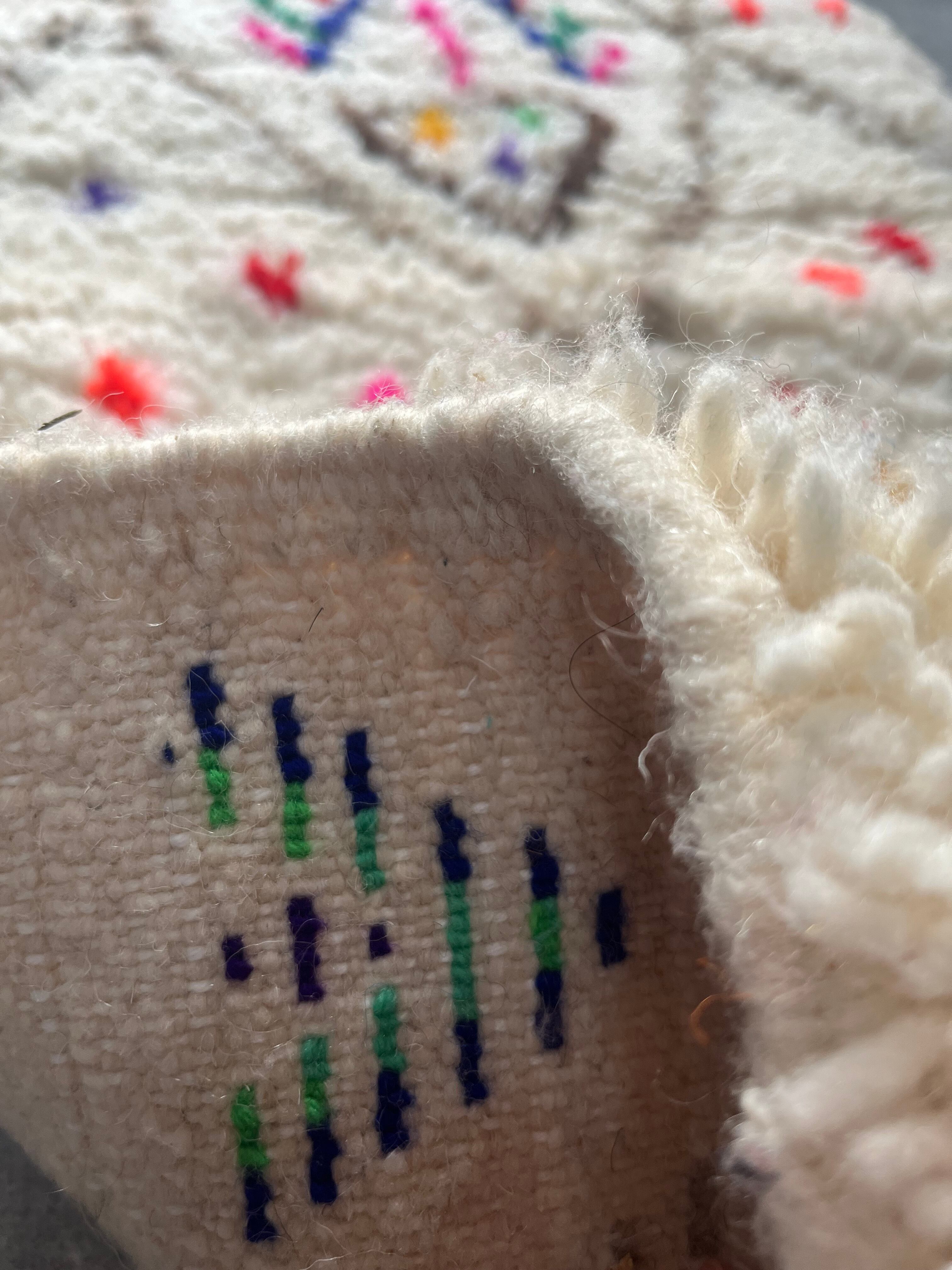 アイボリーのウール地に、グレーで幸せを願うダイヤのマークが大きく描かれ、それを背景に鮮やかな色とりどりに描かれたドットや、特徴的なデザインがとても芸術的な1枚。