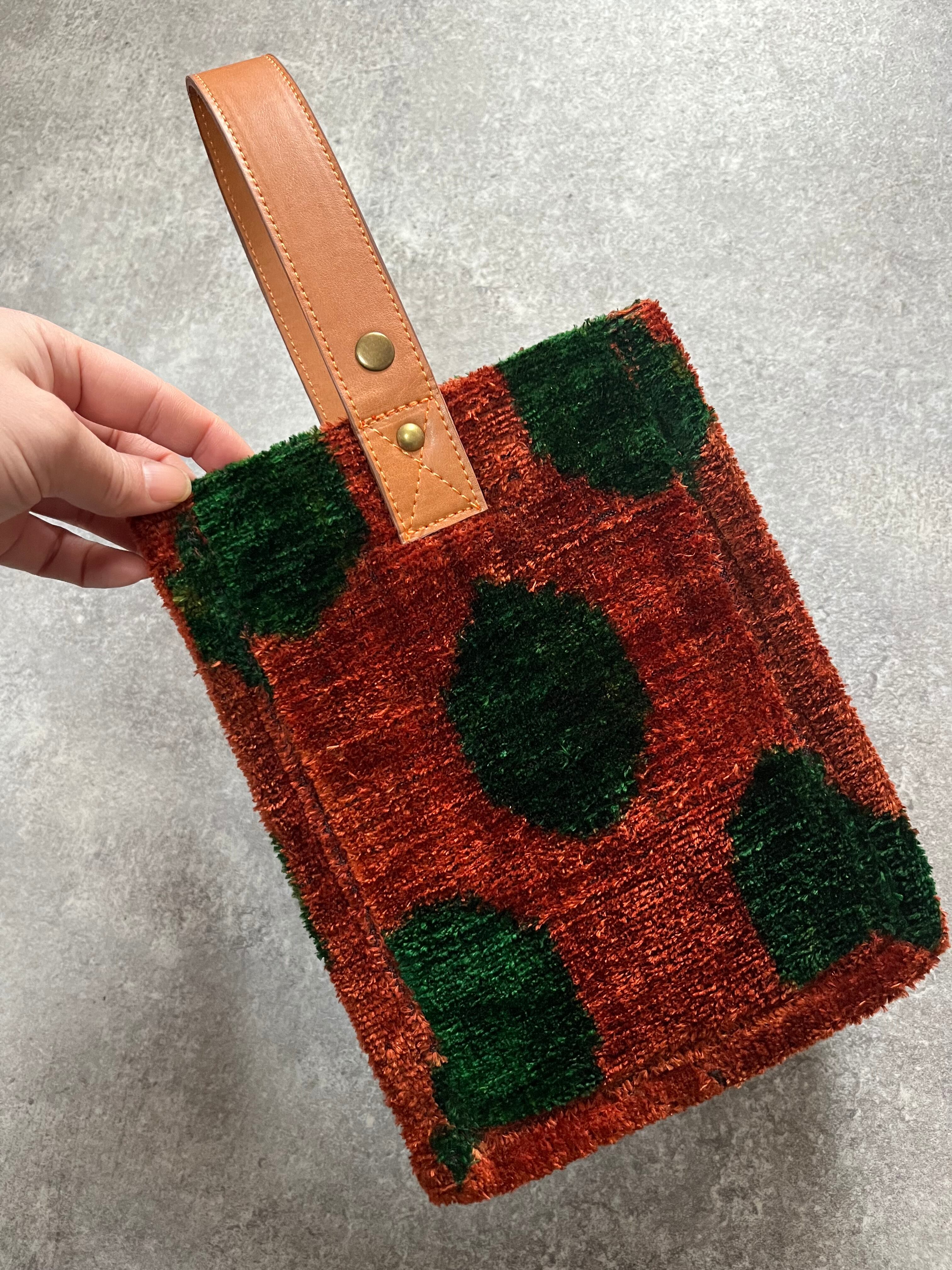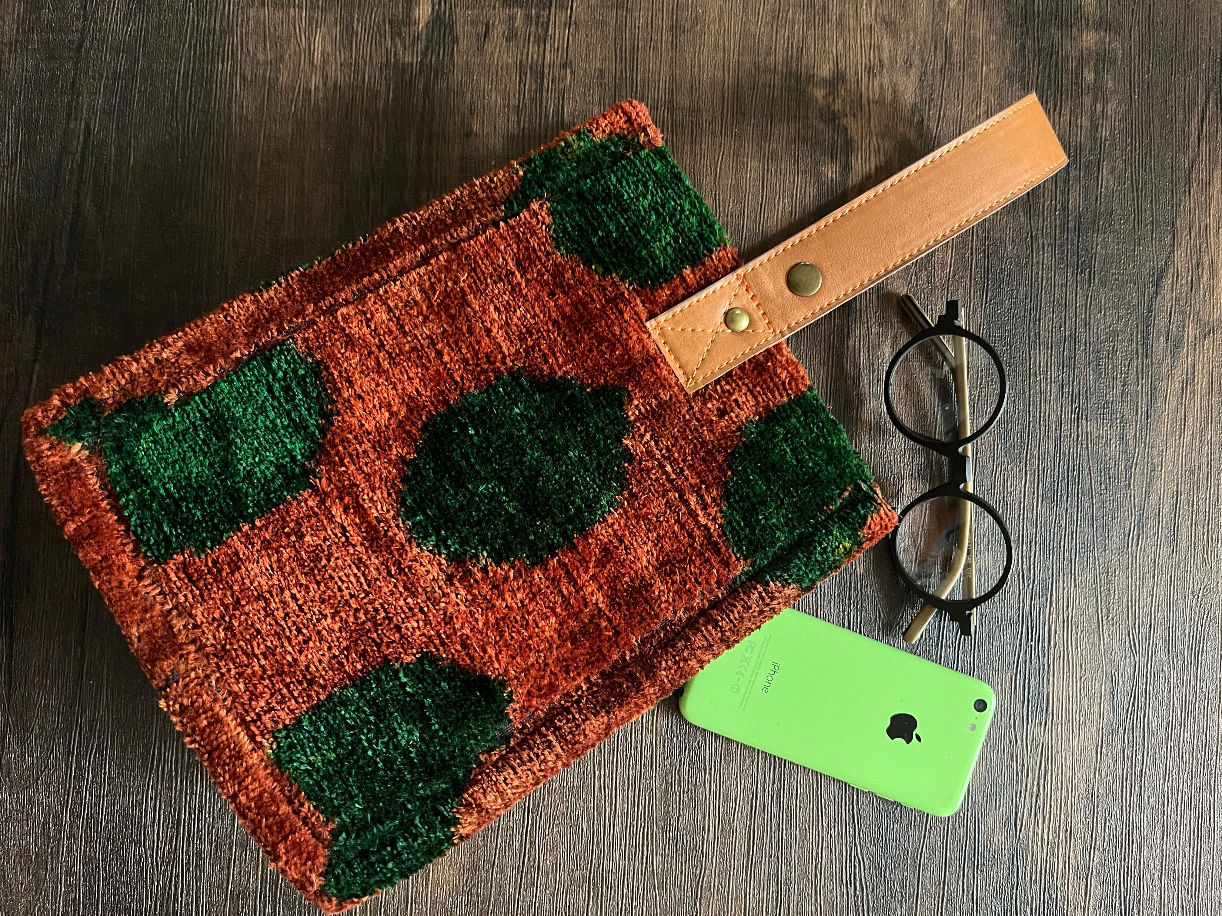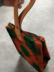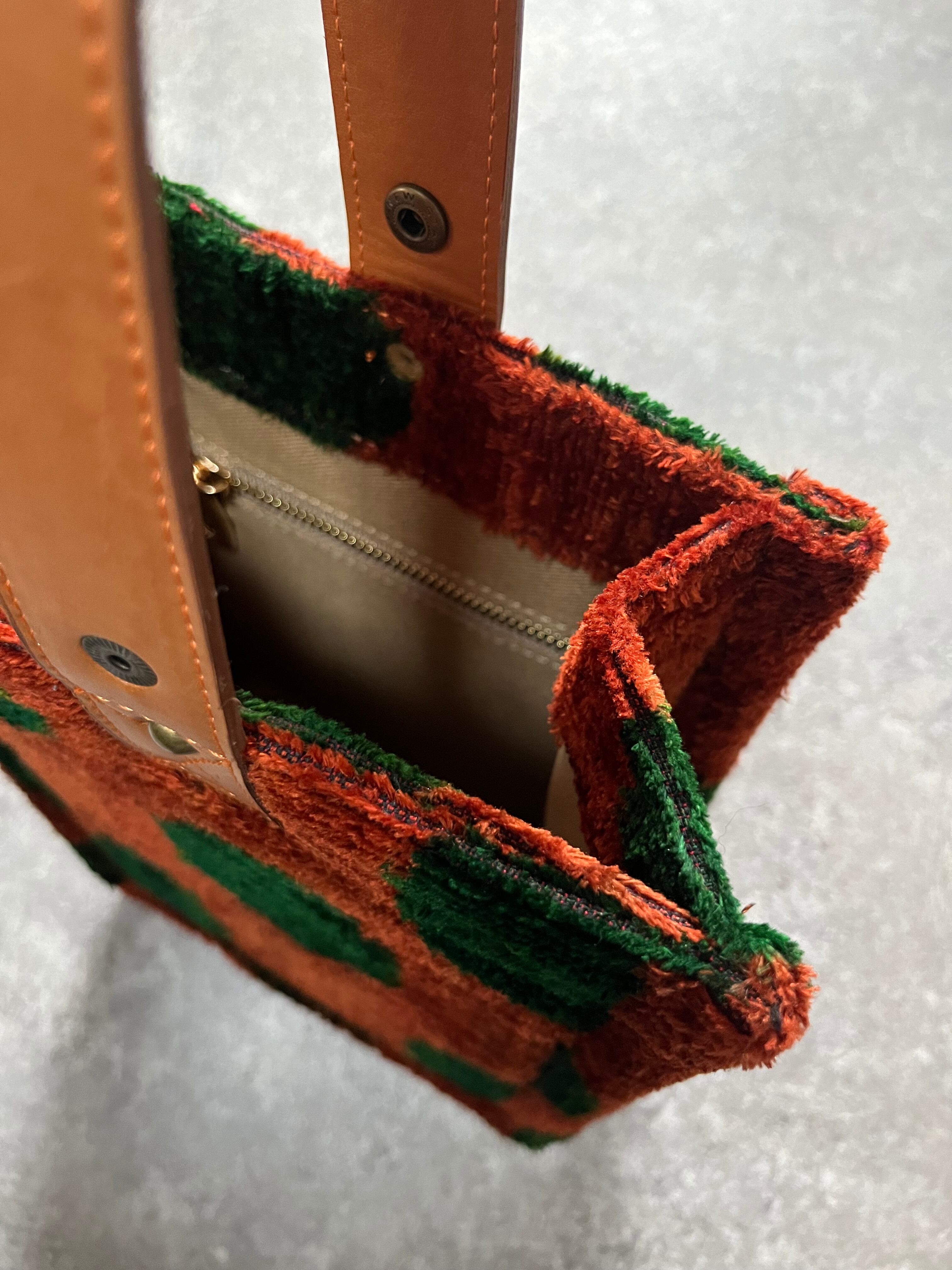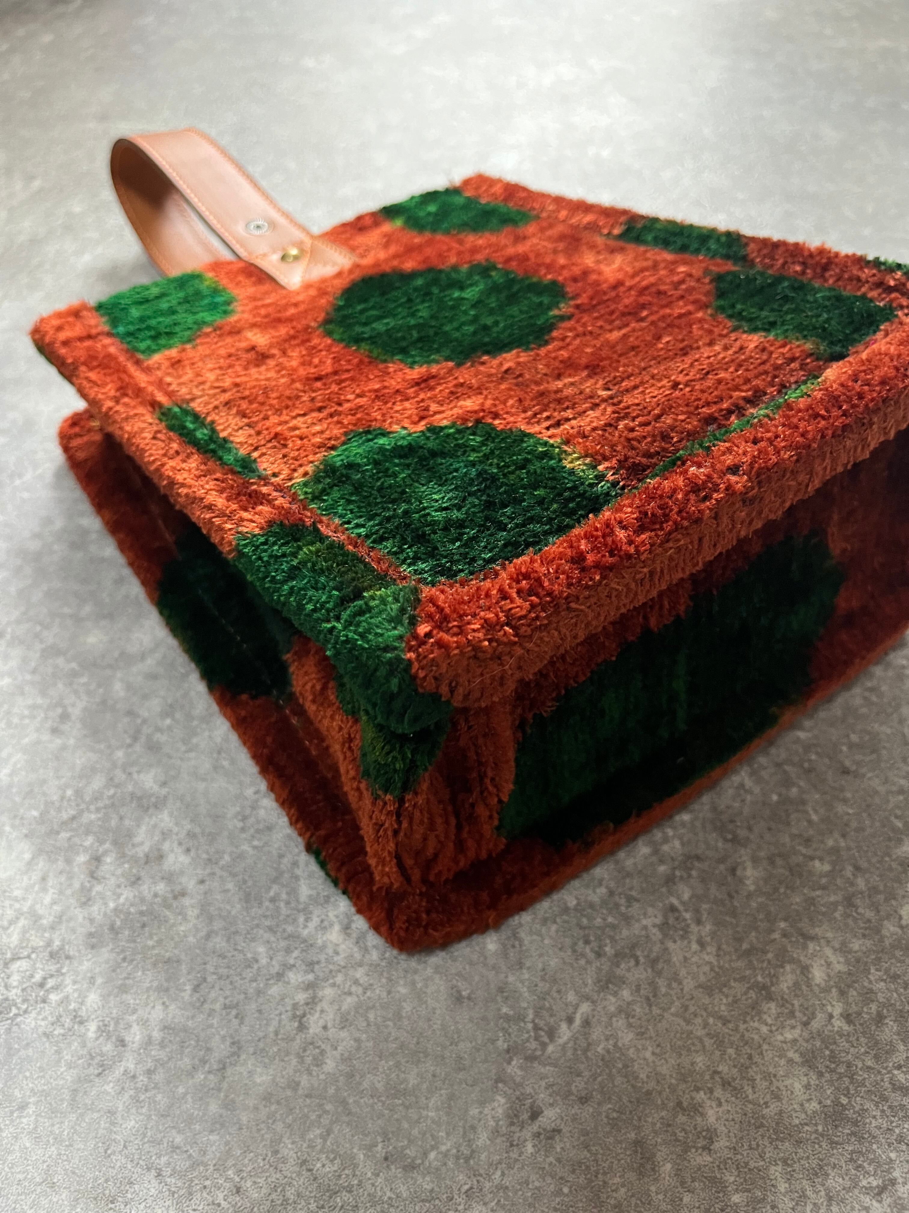 オレンジ地に緑のポイントカラーであしらわれたみんな大好きドット柄バッグ。