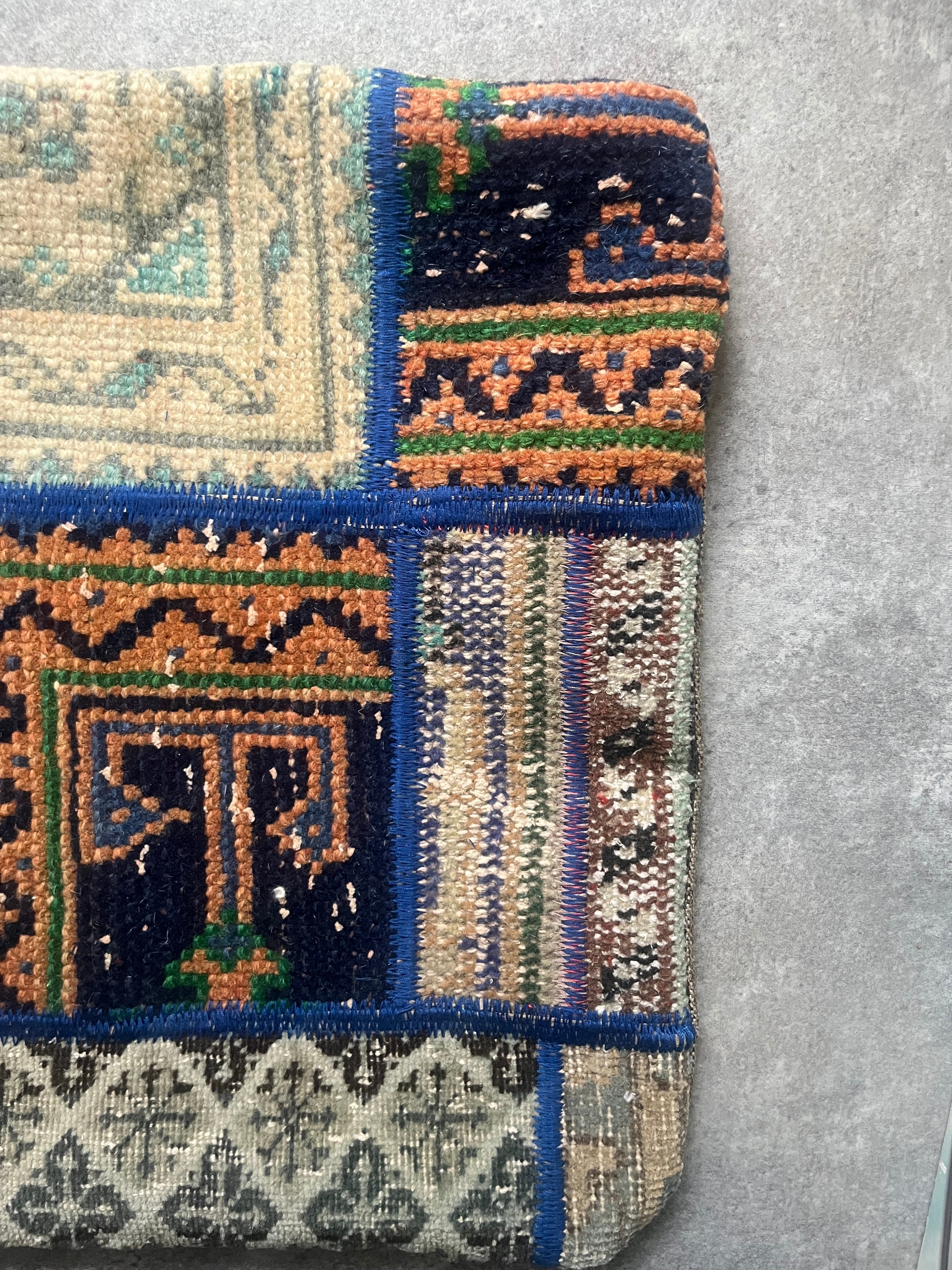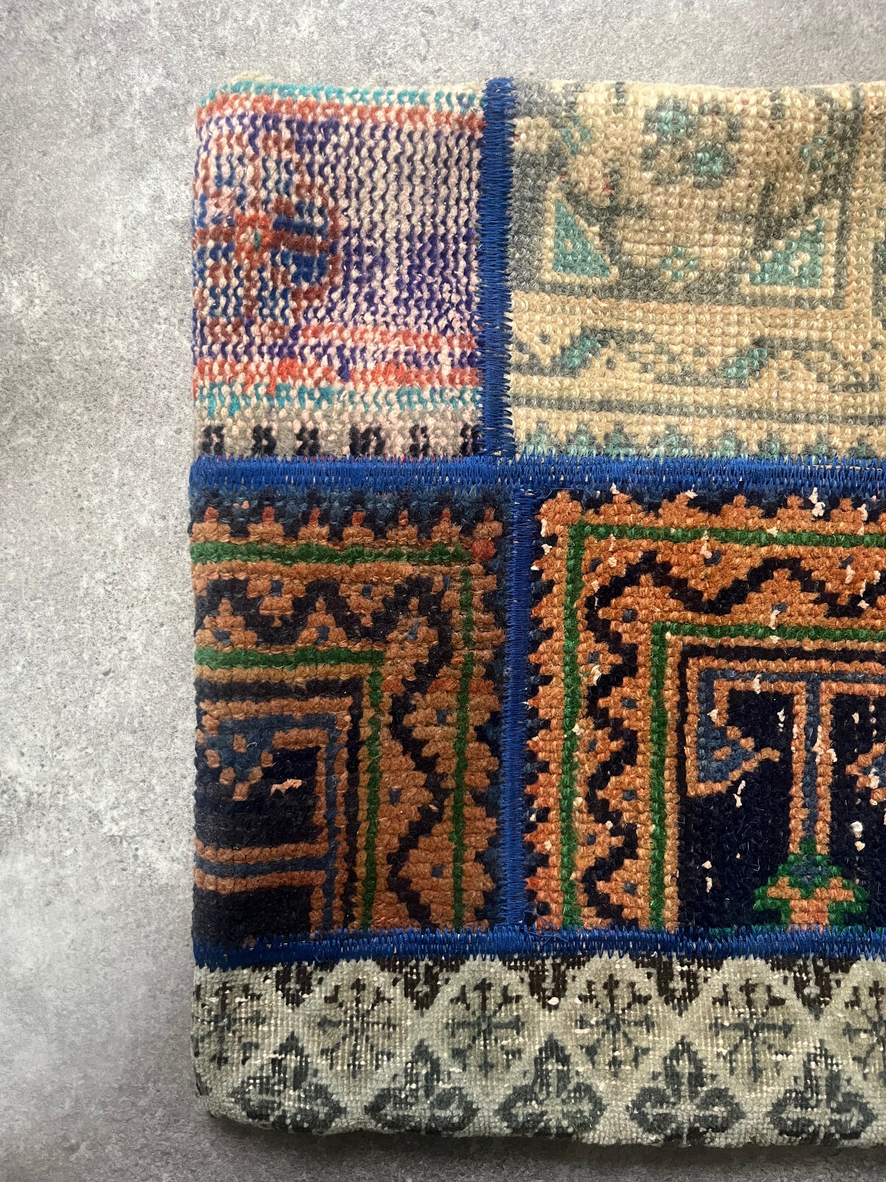 ヴィンテージラグの断面を1枚のデザインに紡ぎ合わせたクッションカバー。
