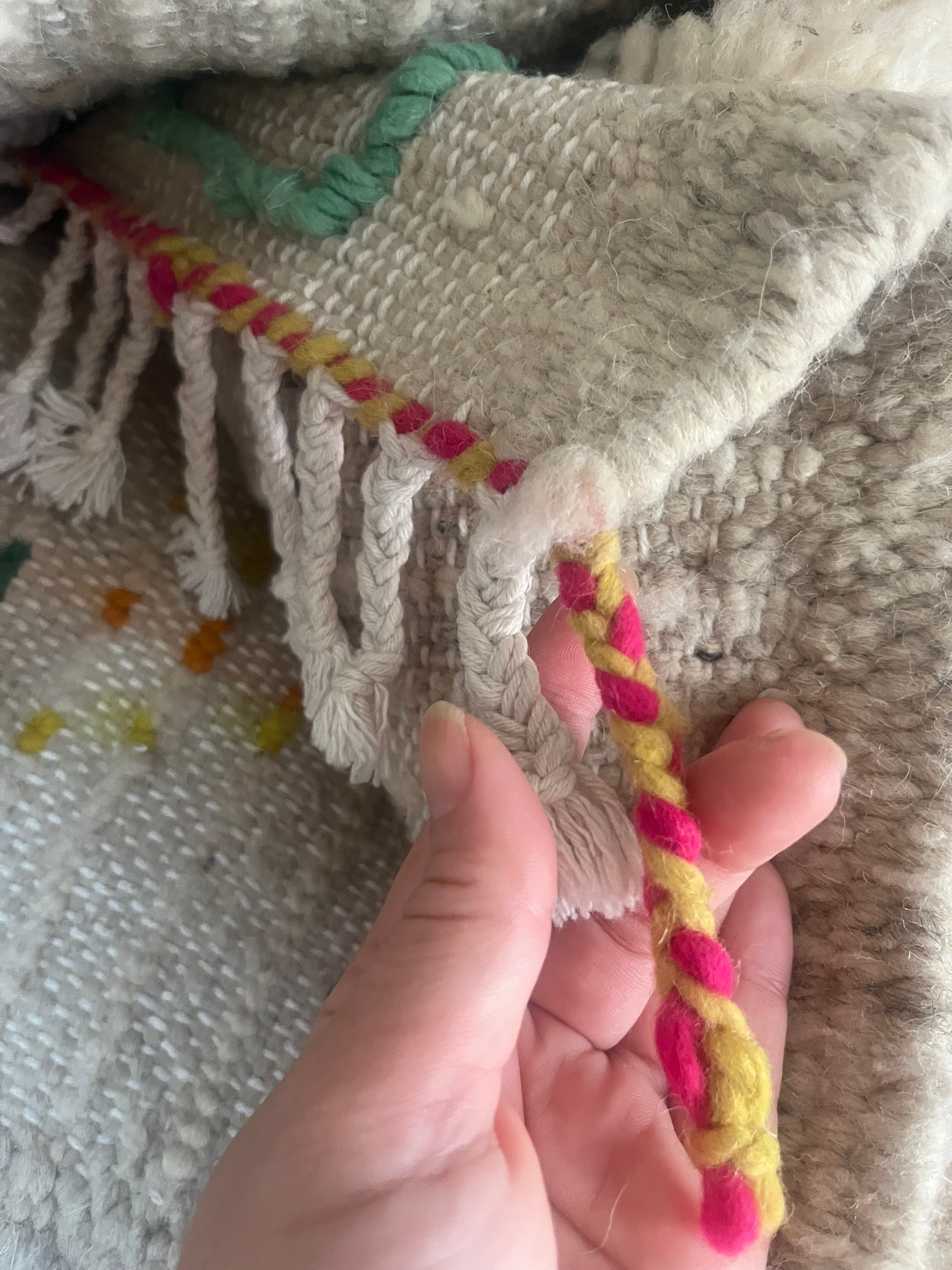 フリンジ寄りの平織りで織られた部分にも図柄が織り込まれておりとても人気だった子。