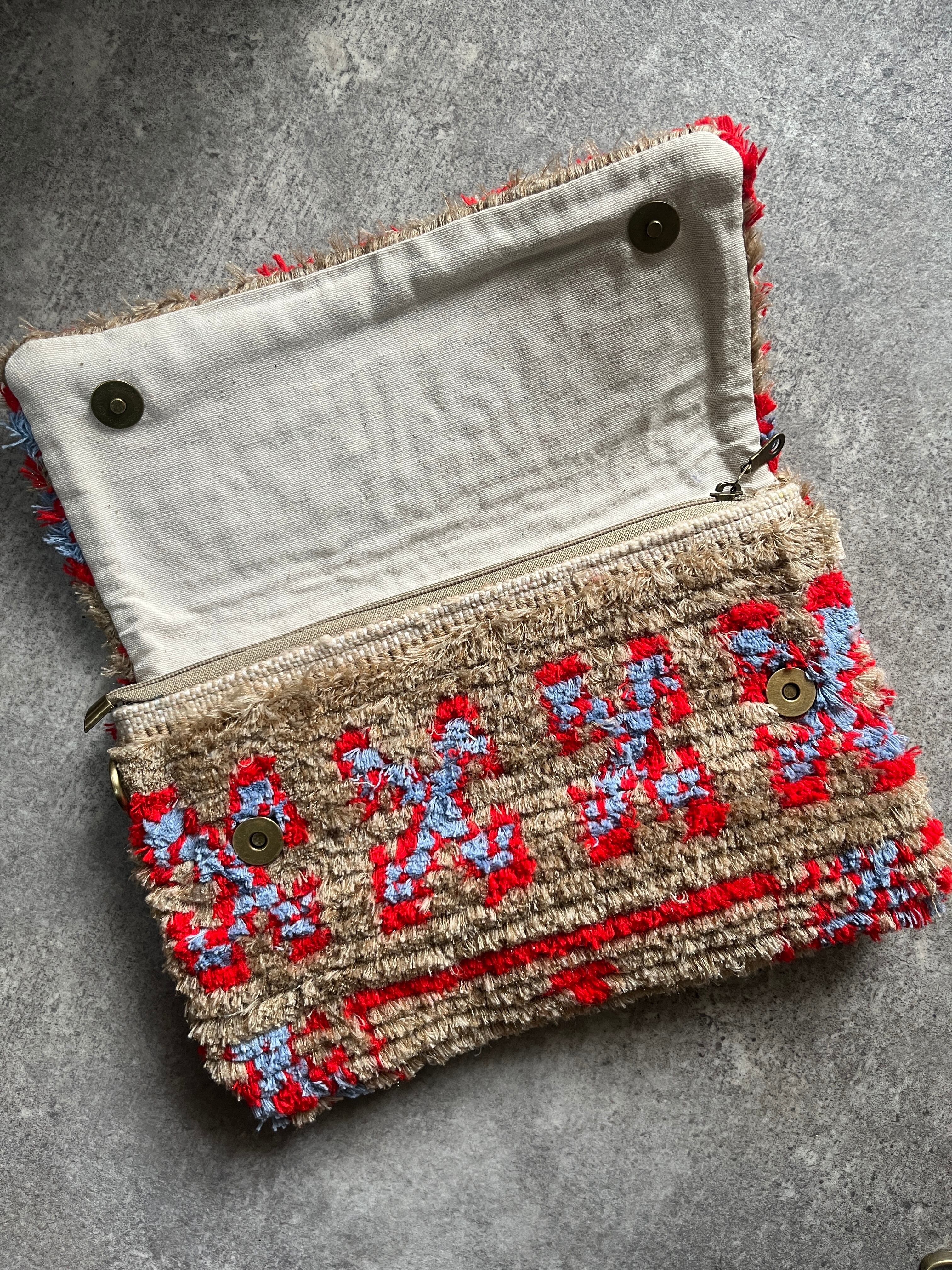 グレー地をベースに、水色と赤色とでデザインされた上品さを感じるバッグ。